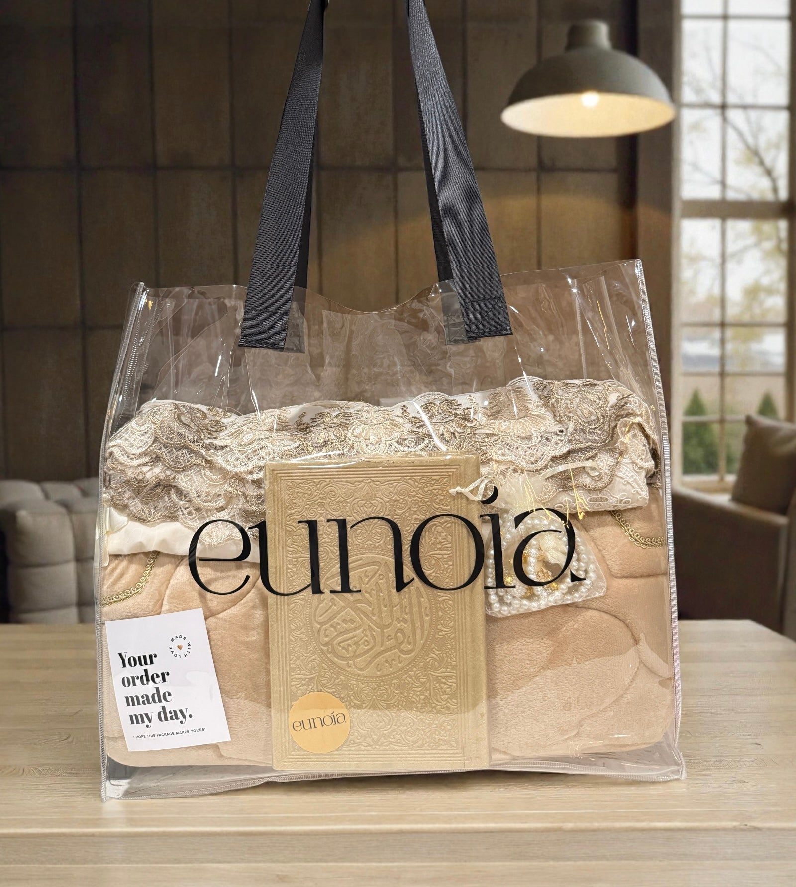 This set creates cute gifts that includes a full matching prayer set, complete with a prayer mat, prayer outfit, prayer beads, and a complimentary Quran.